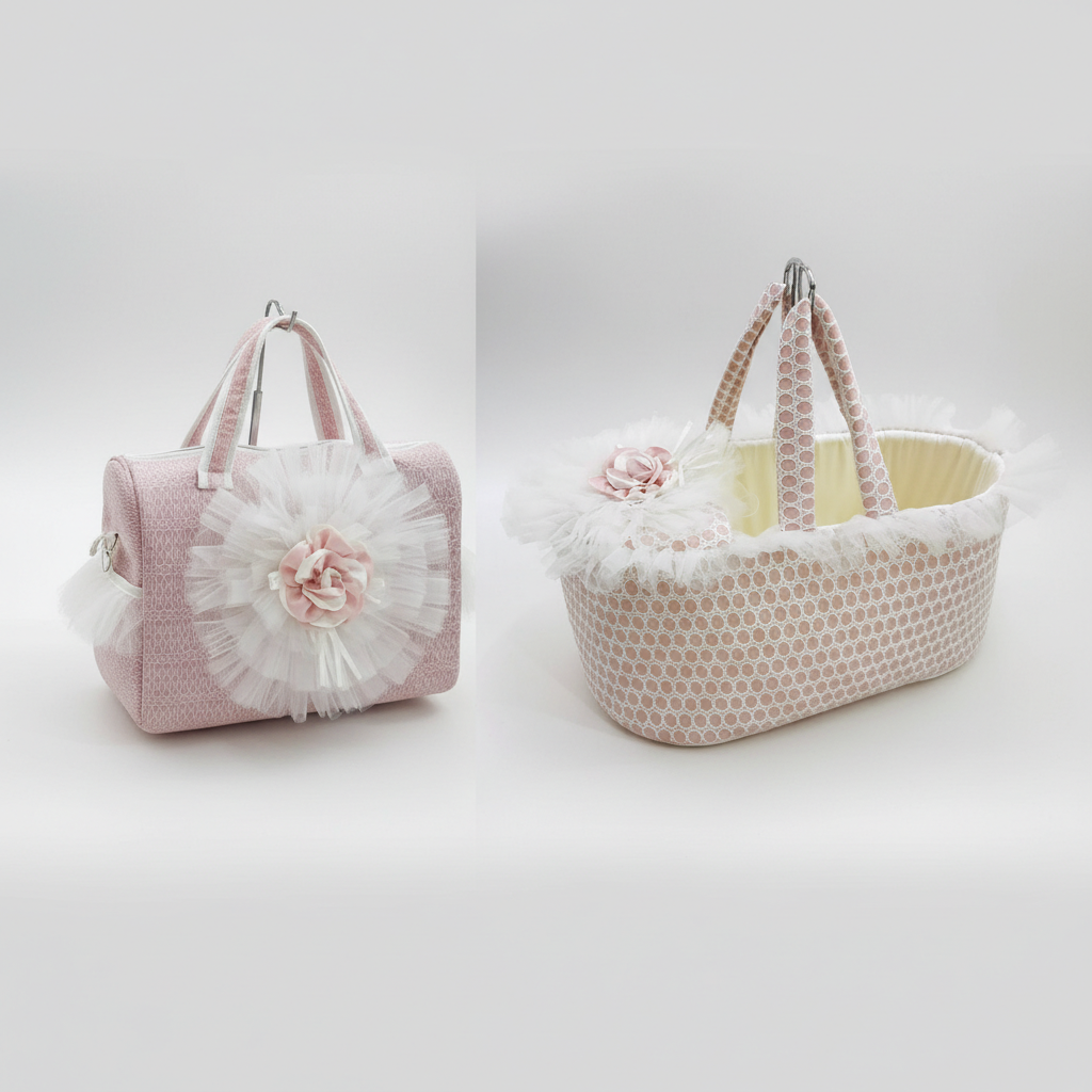 حمالة بيبي مع شنتة منقط زهر بوردة ساتان